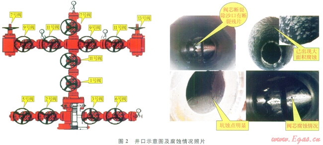 1)阿姆河酸性氣田高含硫化氫和二氧化碳,單井產(chǎn)能高。氣田屬于中一嚴重腐蝕環(huán)境,井口設(shè)備在生產(chǎn)過程中出現(xiàn)了不同程度腐蝕,出現(xiàn)腐蝕的井口位置基本相似,主要表現(xiàn)為坑蝕、點蝕,伴有閥芯斷裂的情況,在一定程度上影響了正常生產(chǎn)。腐蝕主要來源于酸性環(huán)境下的沖蝕腐蝕。