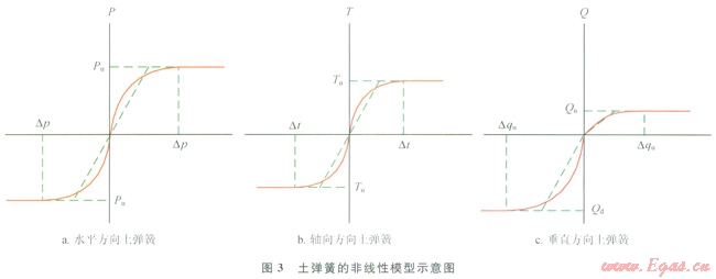 根據ASCE Guidelines.for the Design of Buried Steel Pipe[21,斷層作用下,土壤對管道的作用可以用彈塑性土彈簧來表示,包括管道軸向、側向和垂向的土彈簧(圖2)。筆者采用管土相互作用(PSI)單元模擬管土相互作用,PSl單元如圖2-b所示,由4個節點組成,單元上端2個節點(3和4)與地表面相連,反映地面運動與位移,下端2個節點(1和2)與管道單元相連,管土相互作用關系以非線性單元剛度表示,單元剛度與土彈簧剛度一致。通過將斷層位移施加在斷層右側PSI單元的土壤節點上可以來模擬斷層的作用。等效土彈簧的力學性能可以用極限抗力與屈服位移2個量來描述。Pu、Tu、Qu和Qd代表了3個方向的極限抗力,Dp、Dt、Dqd和Dqu代表了3個方向的屈服位移(圖3)。