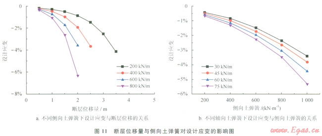 使用同樣的方法分析側向土彈簧對設計應變的影響(圖11)。對比圖11和圖10,可以得到設計應變隨側向土彈簧的變化形式與軸向土彈簧類似。從圖11-a可以發現,側向土彈簧越大,設計應變越大,設計應變在不同側向土彈簧下與斷層位移量均保持類似冪函數關系;從圖11-b可以發現,設計應變隨側向土彈簧也保持著類似冪函數的關系。