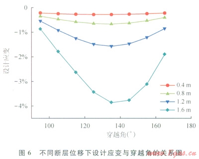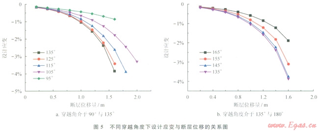 為了更深入分析設計應變與穿越角度的關系,圖6給出了不同斷層位移下設計應變隨穿越角度的變化關系。從圖6可以看出,當斷層位移量小于0.8m時,設計應變較小,變化也較?。划敂鄬游灰屏看笥?/span>0.8m時,設計應變隨著穿越角度的增大先增大后減小,在所有斷層位移下,設計應變與穿越角度之間存在著相似的函數關系,可以用二次多項式來描述。
