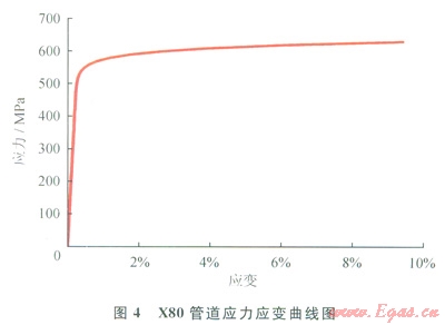 式中E為管材的初始彈性模量;e為應變;s為應力;ss為管材的屈服應力;a和N為R-O模型參數。對X80鋼管材拉伸實驗結果的真實應力應變曲線下限值進行擬合[10],得到參數取值如下:E=206000MPa;ss=2552MPa;a=0.86;N=28。管道真實應力應變關系如圖4所示。