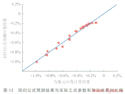 為了驗證公式的準確性,本使用“西氣東輸二線”工程中30種工況參數的應變計算結果進行對比分析(圖12),從圖12中可以發現本文給出的回歸公式精度較高,可以對穿越角度大于90°時跨斷層區XS0鋼管的設計應變進行預測。