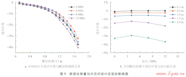考慮0MPa、4MPa、8MPa、12MPa這4種不同內壓工況下設計應變的變化規律。由有限元結果可以得到,設計應變在不同內壓下隨斷層位移的變化規律比較類似(圖9)。為了進一步分析內壓對設計應變的影響,分析了不同斷層位移下設計應變隨內壓的變化情況。從圖9-b可以看出,當斷層位移量大于1m時,設計應變在4MPa時應變最小;當斷層位移量小于1m時,設計應變較小,不同內壓下設計應變的差距變得不大明顯。