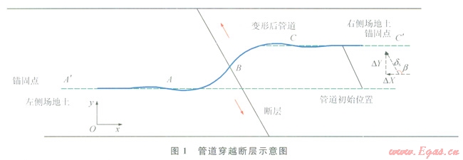 活動斷層是地震區天然氣長輸管道的主要威脅,斷層作用下管道會發生軸向和垂向位移,導致管道內產生較大的應變而失效。所以斷層作用下管道應變的準確計算對斷層區管道的設計與安全評估具有重要意義。國內外大量學者針對斷層區管道的應力應變分析進行了大量研究[1-12],提出了多種理論和數值計算方法,其中在工程中應用最廣泛的為Newmark-Hall和Kennedy方法[3-4],但是其只能求解管道穿越角小于90°時的管道受拉情況,無法求解管道穿越角大于90°時管道的受壓情況。