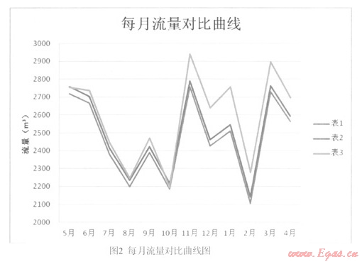 (3)考慮到10月國慶長假、2月春節長假因素,造成其單月用氣量下降。排除此因素,全年最低用氣量出現在8月,而8月恰好是全年平均氣溫最高的月份。而從整個曲線來看,冬季用氣量明顯上升,夏季用氣黽明顯下降,這與實際情況非常吻合。說明溫度對于用氣量有顯著影響。同時從整個曲線來看,冬季皮膜表的曲線大幅低于標準表(超聲波),夏季則非常接近,說明溫度是影響膜式表誤差的重要因素。