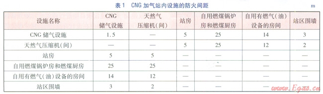 按規范GB 50156—2012中表5.0.13-1的規定,CNG加氣站內設施的防火間距見表1。