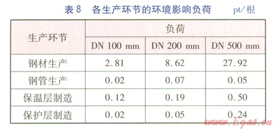 由表7可知,固體廢棄物對環(huán)境影響的貢獻(xiàn)最大,其次分別是懸浮顆粒物、酸化、全球變暖、資源耗節(jié)中鋼材生產(chǎn)的環(huán)境影響最大,其次是保溫層,最后是保護(hù)層和鋼管生產(chǎn)。主要原因是鋼材生命周期過程中礦石的開采和鋼鐵冶煉都會產(chǎn)生大量的固體廢棄物,這就造成固體廢棄物對環(huán)境影響比較大。在計(jì)算生產(chǎn)環(huán)節(jié)環(huán)境影響時(shí),鋼材生產(chǎn)產(chǎn)生大量廢棄物,同時(shí)在此環(huán)節(jié)中,資源耗竭所占比重也比較大,因此鋼材生產(chǎn)就成為保溫管道生產(chǎn)階段環(huán)境影響最大的環(huán)節(jié)。公稱管徑100~500mm鋼材生產(chǎn)形成的環(huán)境影響負(fù)荷分別為2.81、8.62、27.92 pt/根。