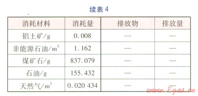 建材的含能(Embodied Energy)近年來在國外得到廣泛研究,含能是指產(chǎn)品從自然界原始材料的掘取,經(jīng)過運(yùn)輸、加工、組裝直至成品出廠前的所有相關(guān)過程的能耗總和,是基于生命周期的能耗統(tǒng)計(jì)數(shù)據(jù)。顧道金[14]利用國外含能數(shù)據(jù),建立了中國建筑產(chǎn)品外推含能數(shù)據(jù)表,并計(jì)算了我國能源使用背景下lMJ含能的生命周期數(shù)據(jù)清單。對于保溫層、外護(hù)管,在計(jì)算環(huán)境影響時(shí)都采用此種方法,生產(chǎn)1kg硬質(zhì)聚氨酯泡沫塑料保溫層、高密度聚乙烯外護(hù)管的生命周期數(shù)據(jù)清單(關(guān)鍵數(shù)據(jù))分別見表3、4。