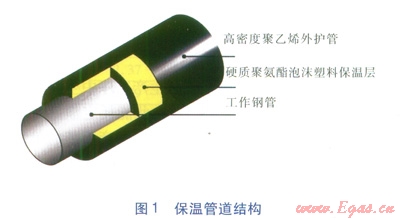 評價(jià)對象是以硬質(zhì)聚氨酯泡沫塑料作為保溫層,高密度聚乙烯作為外護(hù)管的保溫管道,具體結(jié)構(gòu)見圖1。選取規(guī)格為DN 100、200、500mm保溫管道進(jìn)行評價(jià),工作鋼管長度均為12m。保溫管道各種技術(shù)參數(shù)執(zhí)行CJ/T 114—2000《高密度聚乙烯外護(hù)管聚氨酯泡沫塑料預(yù)制直埋保溫管》,3種規(guī)格保溫管道的具體技術(shù)參數(shù)見表1。