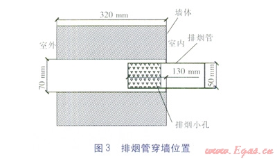 經測量,進入穿墻孔的排氣管長度只有130mm,并沒有伸出厚度為320mm的穿墻孔,開有多個小孔的排氣管最外端實際仍處于穿墻洞內。涉案熱水器工作時煙氣只能排入穿墻孔洞內(詳見圖3)。