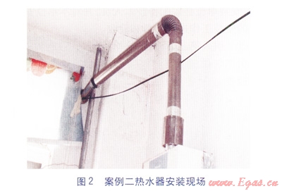 事故燃氣熱水器排氣管安裝不符合GB 6932—2001《家用燃氣快速熱水器》附錄A《家用燃氣快速熱水器安裝技術要求》A4.1.3中防倒風罩以上的排氣管室內垂直部分不得小于250mm以及排氣管頂端必須安裝有效的防風、雨、雪的風帽的要求。此種情況下,極易出現在使用熱水器時,由于煙道排氣不暢,甚至出現倒風,致使燃氣燃燒產生的煙氣不能有效排到室外。