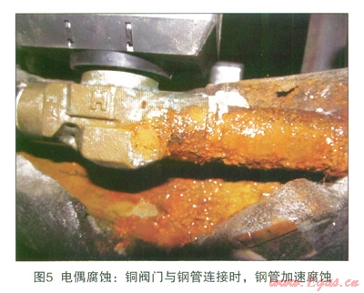在金屬活動順序表中,Fe要比Cu活潑,在相同的環境中,Fe的電位要比Cu負。當異種金屬相接觸,處于相互連通的電解質中時,由于不同金屬之間存在實際電位差而使電位較低的金屬腐蝕速度比原來增大,電位較高的金屬的腐蝕速度減小,這種現象稱為電偶腐蝕[4],見圖5所示。當鋼與銅相互接觸時,鋼的腐蝕速率比其單獨存在時加大。在閥門位置,利用銅包鋼或者銅網進行接地時,由于電偶腐蝕的作用,會加速閥門的腐蝕。同時由于銅的良好導電性和自腐蝕較低的特性,利用銅材質進行接地時,接觸電阻要比閥門直接接地更低,在這種情況下,陰極保護電流集中流入流出的現象會更加嚴重。