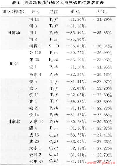 前人研究表明,川西北部地區下三疊統飛仙關組烴源條件極差,已歸屬非烴源巖之列,所產天然氣主要氣源應來自下伏烴源巖,且具有混合氣特征。從天然氣碳同位素分析,δ13C1、δ13C2明顯較二疊系天然氣重3.35‰~4.91‰,而地層的實際埋深卻比二疊系淺600~700m,如果與奧陶系、二疊系天然氣同源的話,根據天然氣同位素分餾效應三疊系碳同位素本應比二疊系碳同位素輕才與實際情況相符。飛仙關組天然氣表現為δ13C1<δ13C2的正碳同位素系列,但兩者相差不大,其天然氣碳同位素特征與川東寶1井長興組天然氣具有相似的碳同位素組成特征(表2),具有沈平(2005)分類的第三類組成特征及混源特征。前人研究表明,該區P。砌底部的“王坡頁巖”可能是飛仙關組的烴源層之一;此外從天然氣乙烷碳同位素看,δ13C2<-28‰,應歸屬油型氣范疇,但特征不如二疊系明顯。總之,飛仙關組天然氣甲烷碳同位素具煤成氣特點,而乙烷碳同位素又具油型氣特征。因此推測河灣場飛仙關組天然氣可能是二疊系碳酸鹽巖油型氣與上二疊統吳家坪組煤成氣的混合所致。