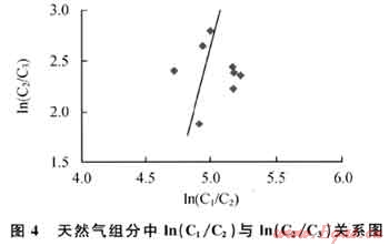 既然河灣場奧陶系、二疊系天然氣與川東石炭系天然氣都來源于志留系烴源巖,為何甲烷碳同位素差異這么大呢?在天然氣生成過程中,存在著2種成因的天然氣,即干酪根裂解氣和原油裂解氣。對于多期成藏的盆地,早期形成的古油藏隨埋深的增大其溫度增高,古油藏中的原油必然要發生二次裂解而形成天然氣。干酪根裂解和原油裂解形成的天然氣中的C1/C2與C2/C3值完全不同:干酪根裂解所形成的天然氣ln(C1/C2)值變化較大,ln(C2/C3)值變化較小;而原油二次裂解形成的天然氣ln(C1/C2)值變化較小,ln(C2/C3)值變化范圍較大[4~9]。由圖4可見,河灣場氣田的天然氣具有原油二次裂解氣的特征。此外,川西北部地區經歷了古油氣藏的形成及多期成藏過程,且泥盆系-侏羅系儲層中廣泛分布瀝青也說明該區存在大量原油裂解氣提供了依據。