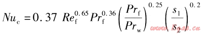 在設(shè)計(jì)過程中,傳熱系數(shù)的計(jì)算只能依靠經(jīng)驗(yàn)公式,對于流體橫掠光管和翅片管的情況都要考慮。光管管束的計(jì)算使用茹卡烏斯卡斯總結(jié)出的平均表面?zhèn)鳠嵯禂?shù)的關(guān)聯(lián)式[5],螺旋翅片和整體翅片管束分別使用Briggs和Young的關(guān)聯(lián)式和Gray和Webb關(guān)聯(lián)式[6]。