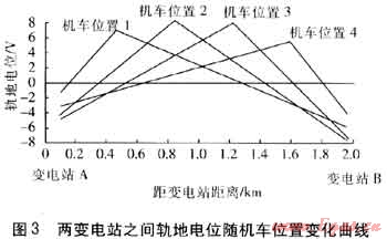 雜散電流的變化與雜散電流源的變化具有一致性,軌交雜散電流的大小隨軌交系統的用途、機車的相對位置和運行狀態不同而變化。機車在每兩個站臺之間都要經歷加速、勻速、減速的過程,不同運行狀態下機車電流不同。隨機車電流及機車位置的變化,軌道電流和軌道對地電位(簡稱軌地電位)也處于變化中,圖3為兩變電站之間軌地電位隨機車位置變化曲線。軌地電位為正時,雜散電流流入大地,軌地電位為負時,雜散電流返回鋼軌。鋼軌泄漏電流位置的變化使得埋地管道對地電位(簡稱管地電位)處于不斷變化之中,管道發生雜散電流腐蝕的位置和強度也在不斷變化[8]。