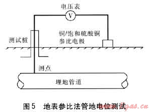 土壤和管道中有電流流過時總會引起電位的變化,通過管地電位偏移可以對雜散電流影響進行判定。管地電位指埋地燃氣管道與對應參比電極之間的電位差。根據參比電極位置不同有直接參比法、地表參比法、近參比法、遠參比法等。地表參比法管地電位測試接線見圖5。對于管地電位波動頻繁地區,可采用電子記錄儀表代替傳統電壓表,引申為管地電位連續監測法。