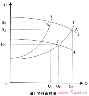② 閥門的開度不變,降低轉速這時揚程特性曲線如曲線4所示,工作點移至C點;流量仍為QB;但揚程為HC;電動機的軸功率與面積0QCCHC成正比。