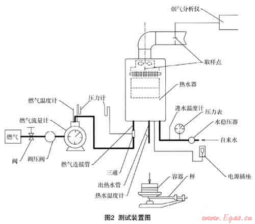 (1) 選定待測熱水器,進行安裝,凋試。對于非恒溫機,將燃氣閥門開至最大,調節出水溫度比進水溫度高40±1℃,當不能調節至此溫度時,在熱水器溫度可調范圍內,淵節至最接近的溫度。對于恒溫機,將溫度設定在最高狀態,適當提高進水樂力,使熱水器在最大負荷狀態下工作;
