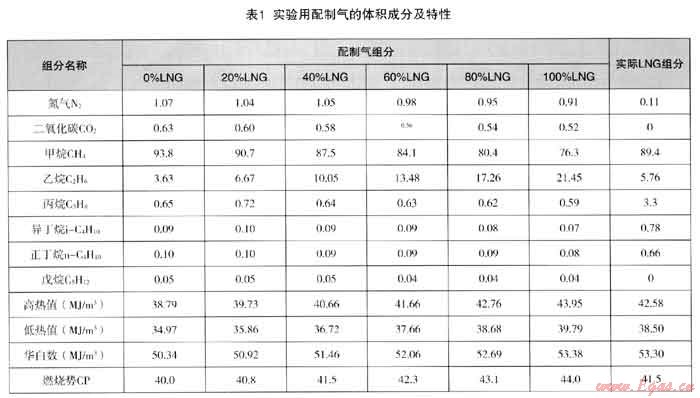 按照上述方案配制的LNG以不同比例(0、20%、40%、60%、80%、100%)與實驗室管輸氣摻混即可模擬真實情況下用戶處的氣源組分。配氣裝置見圖1,配氣時采取西氣-乙烷-氮氣多次交替進入的方式,盡可能保證均勻。監測膜式燃氣表處的燃氣溫度,以便于進氣量的修正。配氣的目標原則是華白數與目標氣一致,燃燒勢盡可能接近。表1給出了實驗室配制的測試用氣組分及特性,以LNG比例作為標識。作為對比,同時給出了LNG的實際組分。