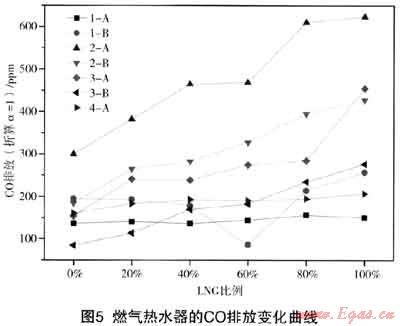 圖5為LNG比例對熱水器C0排放的影響。隨著LNG比例的增加,熱水器的C0值呈現增大趨勢。