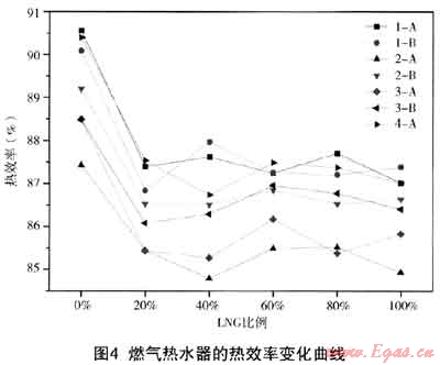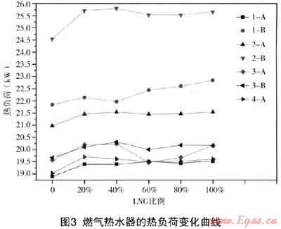 理論上似乎可以用華白數來預測熱負荷的變化,從100%管輸氣變化到100%LNG,華白數增加了6%,對于不同品牌的熱水器,熱負荷的增加基本上未超出5%,熱水器1-B達到最高的偏差4.6%。個別點的熱負荷與總體變化趨勢的偏離可以認為是燃氣粘度導致噴嘴流量發生變化所致。