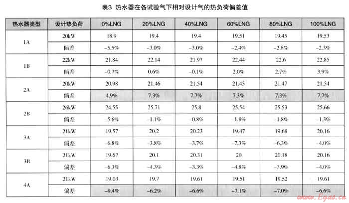 比較各型號熱水器在設計氣下的熱負荷,得出在氣源從100%管輸氣變化到100%LNG時每種熱水器的熱負荷偏差值。表巾熱負荷偏差較大者用棕色底紋標識出。可知熱水器2-A與4-A在氣源變化時會發生比較明顯的響應,可能導致用戶處的不滿。