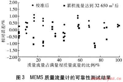 用于城市天然氣計量的質量流量計,其可靠性十分重要,可靠性故障會給燃氣管理帶來困難,甚至引起貿易糾紛。在MEMS質量流量計的可靠性測試中,采用了加速實驗的方法。一臺管徑為32mm,最大標稱流量為16m3/h的MEMS質量流量計在校準后和累積流量達到32650m3后的質量流量相對誤差見圖3,同一工況、同一質量流量下的3個相對誤差值代表3次重復性測量的結果(圖3中有些點重合)。該MEMS質量流量計適用于小型餐飲用戶等的天然氣計量,這類用戶平均每天用氣約6h,平均小時流量約為8m3/h,因此32650m3的天然氣約需要使用2年。由圖3可知,累積使用2年后,MEMS質量流量計的測量精度仍能滿足要求。