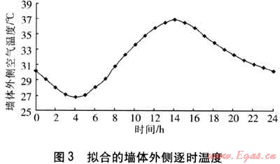 b. 墻體外側(cè)空氣溫度呈簡諧波規(guī)律變化,本文選取武漢作為夏熱冬冷地區(qū)的典型城市進(jìn)行分析,利用武漢夏季某典型日的室外空氣溫度[15]。進(jìn)行計算,擬合的墻體外側(cè)逐時溫度見圖3。
