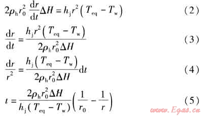 由以上分析可知,首先在液-液分界面處形成一個球形水合物膜層,水和客體物質(zhì)分別通過水合物膜層向兩側(cè)擴(kuò)散以便相互接觸,促進(jìn)水合物的生長。假設(shè)此時水合物向兩側(cè)的生長率相同,即rh=r0+dr,rb=r0-dr,當(dāng)t=0時,r=r0,則由式(1)得到式(2)~(5)。