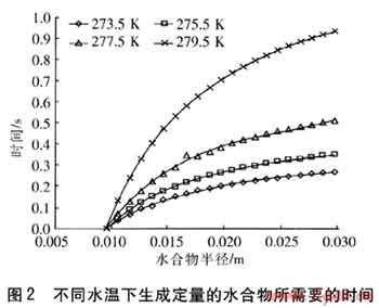 以制冷劑HCFC-141b作為客體物質(zhì)進(jìn)行計(jì)算,計(jì)算中取HCFC-141b的量為1mol。計(jì)算得知初始時刻r0為9.7mm,依據(jù)理論參數(shù),計(jì)算了不同水溫下生成定量水合物所需要的時間,見圖2。
