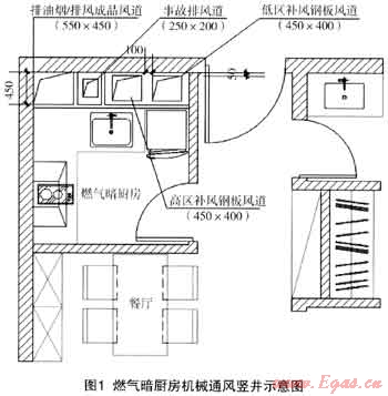 第二方案,燃?xì)獍祻N房設(shè)置排油煙系統(tǒng)、事故排風(fēng)系統(tǒng)、補(bǔ)風(fēng)系統(tǒng):燃?xì)庑孤﹫?bào)警及排油煙/排風(fēng)機(jī)出現(xiàn)故障時(shí),聯(lián)動(dòng)切斷燃?xì)夤艿拦?yīng)的總閥門(mén),所有通風(fēng)設(shè)備均為防爆設(shè)備。采用了很多主動(dòng)技術(shù)來(lái)加強(qiáng)通風(fēng),如圖1、圖2所示: