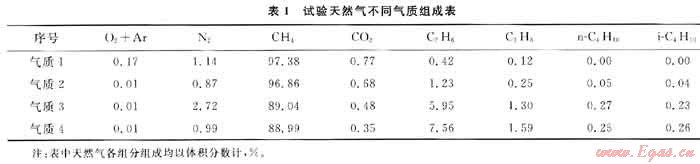 為了考察不同氣質天然氣組成條件對部分氧化反應的影響,選擇了4種氣質條件進行試驗,其組成分別如表1所示。