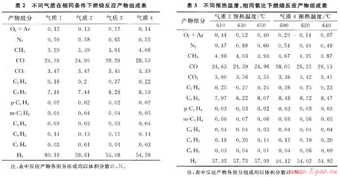 為了考察不同預熱溫度對燃燒反應的影響,筆者主要選擇了以下工況對氣質2和氣質4進行試驗:天然氣流量為4700m3/h,預熱溫度為600~625℃,氧比為0.570,熱淬火水用量為39m3/h,冷淬火水用量為35m3/h。