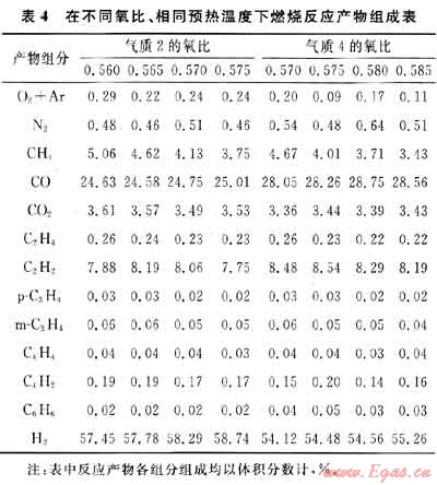 從表3也可以看出,相同氧比條件下,不同氣質天然氣的最佳裂解預熱溫度也不同,總有機碳含量較高的氣質4對應的最佳預熱溫度約為630℃,而氣質2對應的最佳預熱溫度約為620℃,兩者相差10℃。氣質4天然氣裂解產物中乙炔含量較氣質2高5.90%(體積分數),這說明有機碳含量高的氣質有利于部分氧化制乙炔反應,同時需要調整預熱溫度。