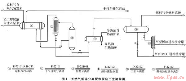 某含汞氣田天然氣處理廠采用節流制冷低溫分離脫水脫烴、注乙二醇防止水合物的處理工藝,主要工藝單元包括脫水脫烴單元、乙二醇再生單元及凝析油穩定單元[7]。脫水脫烴單元的工藝流程如圖1所示,自集氣裝置來的原料天然氣,從上部進入原料氣預冷器(E-22101)。自乙二醇再生及注醇裝置來的乙二醇貧液通過霧化噴頭霧化,噴射入原料氣預冷器,和原料氣在管程中充分混合接觸后,與白干氣過濾分離器(F-22101)來的冷干氣進行換熱,被冷卻至-5℃左右。原料天然氣再經J-T閥作等焓膨脹,氣壓降至6.4MPa,溫度降至-30℃左右,再從中部進入低溫分離器(D-22101)進行分離,分離出液態含醇液和凝析油。干氣進入干氣過濾分離器(F-22101)進一步分離出夾帶的少量的含醇液和凝析油,再進入E-22101殼程與原料天然氣逆流換熱,換熱后的干氣輸送至增壓站。