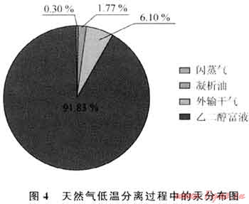 為了定量分析含汞天然氣低溫分離過程中汞的分布規律,以原料氣汞含量為100μg/m3為例,利用VMGSim軟件對天然氣脫水脫烴工藝流程進行模擬,其關鍵物流點的汞濃度見表2。根據模擬結果,可計算出標準狀態下(20℃,101.325kPa)閃蒸氣、未穩定凝析油、乙二醇富液和外輸干氣中的汞濃度分別為1960.43μg/m3、80.77μg/L、4.69mg/L和6.11μg/m3。原料氣中的汞在各物流中的分布情況如圖4所示。由圖4可知,含汞天然氣經過低溫分離后,原料氣中91.83%(質量分數)的汞進入了乙二醇富液中,6.10%(質量分數)的汞進入了外輸干氣中,1.77%(質量分數)的汞進入了未穩定的凝析油中,剩余0.30%(質量分數)的汞進入了三相分離器閃蒸氣中。