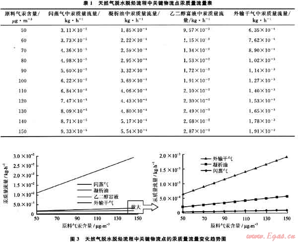 2) 原料氣中的汞絕大多數進入了乙二醇富液中,乙二醇對汞的富集作用十分明顯;少數汞進入了外輸干氣中,外輸干氣的汞含量約比原料氣的汞含量低一個數量級,低溫分離過程可有效降低外輸干氣中的汞濃度;極少數汞進入了凝析油和三相分離器閃蒸氣中。
