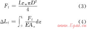 對于帶封隔器井下管柱,隨著井筒壓力、溫度等參數變化而產生溫度效應、活塞效應、鼓脹效應、螺旋彎曲效應。對這4個基本效應產生的管柱變形及其變形力,國內外學者已經做了大量研究,此不贅述。對于深層氣井,高速擠酸過程中,流體粘滯摩阻效應是引起管柱變形的重要因素,也是造成管柱、封隔器失效的主要原因。因此,在分析管柱變形時除了要考慮上述4種基本效應外,還必須考慮流體粘滯摩阻效應,粘滯摩阻力(Ff)和摩阻效應變形(△Lf)分別由下式表示[7~8]: