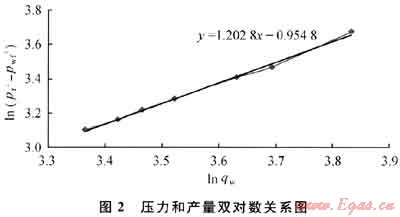 將測試數據在雙對數坐標上以qw為橫坐標,pr2-pwf2為縱坐標作圖,根據截距為J和斜率1/n就可以確定產能方程。對測試數據進行回歸分析,確定J和n,結合煤層煤粉和砂的產出狀況,確定在不破壞煤層原始狀態下的最大產水量,進而確定生產壓差。