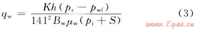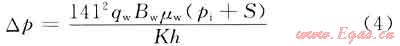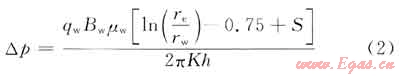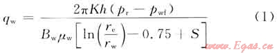 在排采初期,煤層中的水在儲層壓力(pr)與井底壓力(pwf)之差作用下進入井中,此時,整個煤儲層中單相流,考慮煤層氣井的泄流體積范罔內為徑向流動,且水相滲流滿足達西定律,同時考慮表皮因子的影響,則第一個階段單相水的產量公式為: