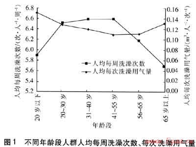 不同年齡段人群人均每周洗澡次數、人均每次洗澡用氣量見圖1。由圖1可知,對于不同年齡段人群,人均每周洗澡次數曲線呈兩邊低中間高的形態,20~55歲年齡段的人群洗澡比較頻繁,65歲以上年齡段人群人均每周洗澡次數最低,這也與該年齡段的生理狀況有關。人均每次洗澡用氣量曲線呈中間低兩邊高相態,由此可知,洗澡次數越頻繁,每次洗澡用氣量越小。