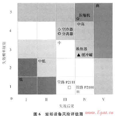 2) 注采氣站風險評估結果表明:壓縮機系統和處理系統風險遠遠大于管路系統風險,其中壓縮機組最大;處理系統設備中空冷器風險最大,其次是緩沖罐(壓縮機出口)、過濾分離器和旋流分離器(圖5);而管路系統中對帶壓的34條管線中,從壓縮機出口到緩沖罐出口的管線P2112~P2118風險最大,其中P2113最大,管路系統風險值大主要是由于壓力和溫度相對較高引起的。采用風險矩陣對各類設備或管路風險定級可知:壓縮機風險為高風險,而管路系統均為中低風險(圖6)。通過風險排序,明確了高風險單元,即可采用HAZOP法進行詳細風險分析。