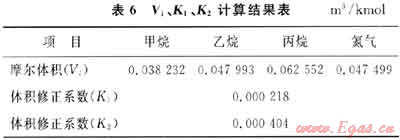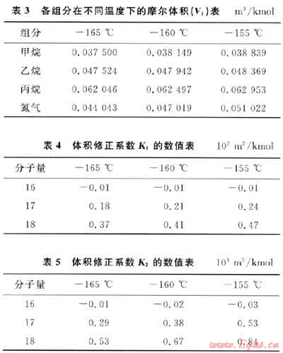 根據LNG液相平均溫度與混合物分子量(M),可以在表3~5中利用線性插值法求得相應溫度下各組分的摩爾體積(Vi)與體積修正系數(K1、K2)值,結果見表6。