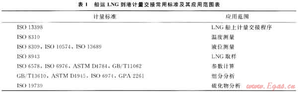 目前,全球LNG接收站(包括國內已經投入運營的廣東大鵬LNG、上海LNG和福建LNG接收站)的到港計量交接多采用IS0、ASTM、GPA等制訂的國際標準[14],常用標準及其應用范圍如表1所示。國家標準GB/T 11062、GB/T 13610等均為同等或非等效采用相應的國際標準;另外,由于國內LNG工業尚處于起步階段且LNG買賣均涉及外方,因此,相關國家標準在實際LNG到港計量交接中尚未得到廣泛的應用[15~16]。