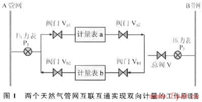 圖1是兩個天然氣管網互聯互通實現雙向計量的工作原理圖。