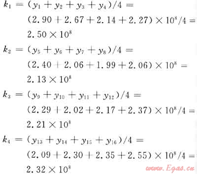 以因素管徑(d)為例,在d的1水平下有4次實驗,為1、2、3、4號實驗,將其歸為第1組。同樣,d的2水平、3水平、4水平分別歸為第2、3、4組。分別計算各組實驗的平均值,填入正交表下部相應的位置上。如d因素各組平均值(k1、k2、k3、k4)為: