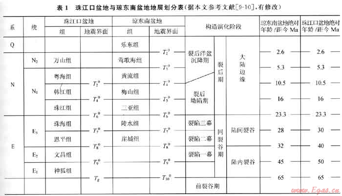據鉆井及地震資料揭示,南海北部陸緣盆地新生代沉積地層自下而上可劃分為:前古近系基底,古近系古新統、始新統及漸新統,新近系中新統、上新統,第四系。盆地構造演化階段經歷了古近紀裂陷階段(具體可劃分為3個裂陷幕),新近紀-早、中中新世裂陷后坳陷階段及晚中新世第四紀裂陷后洋盆沉降期3個階段(表1)。