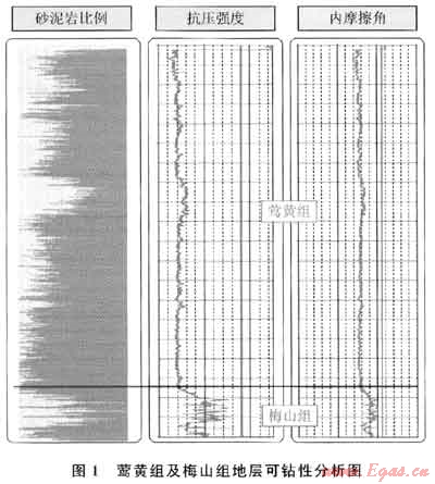 Φ311.15mm井段面臨著井段長、作業時間長、地層跨度大、下部層位石灰質含量高、二次造斜等諸多挑戰,鉆頭選型是否合理,關系到整口井的時效高低。本井段穿越鶯黃組下部、梅山組、三亞組(部分井缺失)地層,鶯黃組下部地層較為均質,地層抗壓強度介于34.5~55.2MPa,內摩擦角在35°以下,具有較好的可鉆性;梅山組地層埋深大,地層抗壓強度介于55.2~103.4MPa,部分層位石灰質含量高,內摩擦角介于36°~40°,對鉆頭的抗沖擊性及抗研磨性具有較高的要求(圖1)。