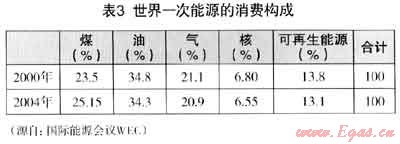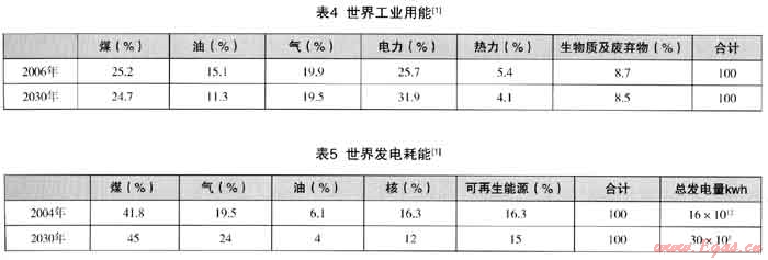 (1) 世界一次能源的消費構成、世界工業用能構成和世界發電用能構成可見表3、表4、表5